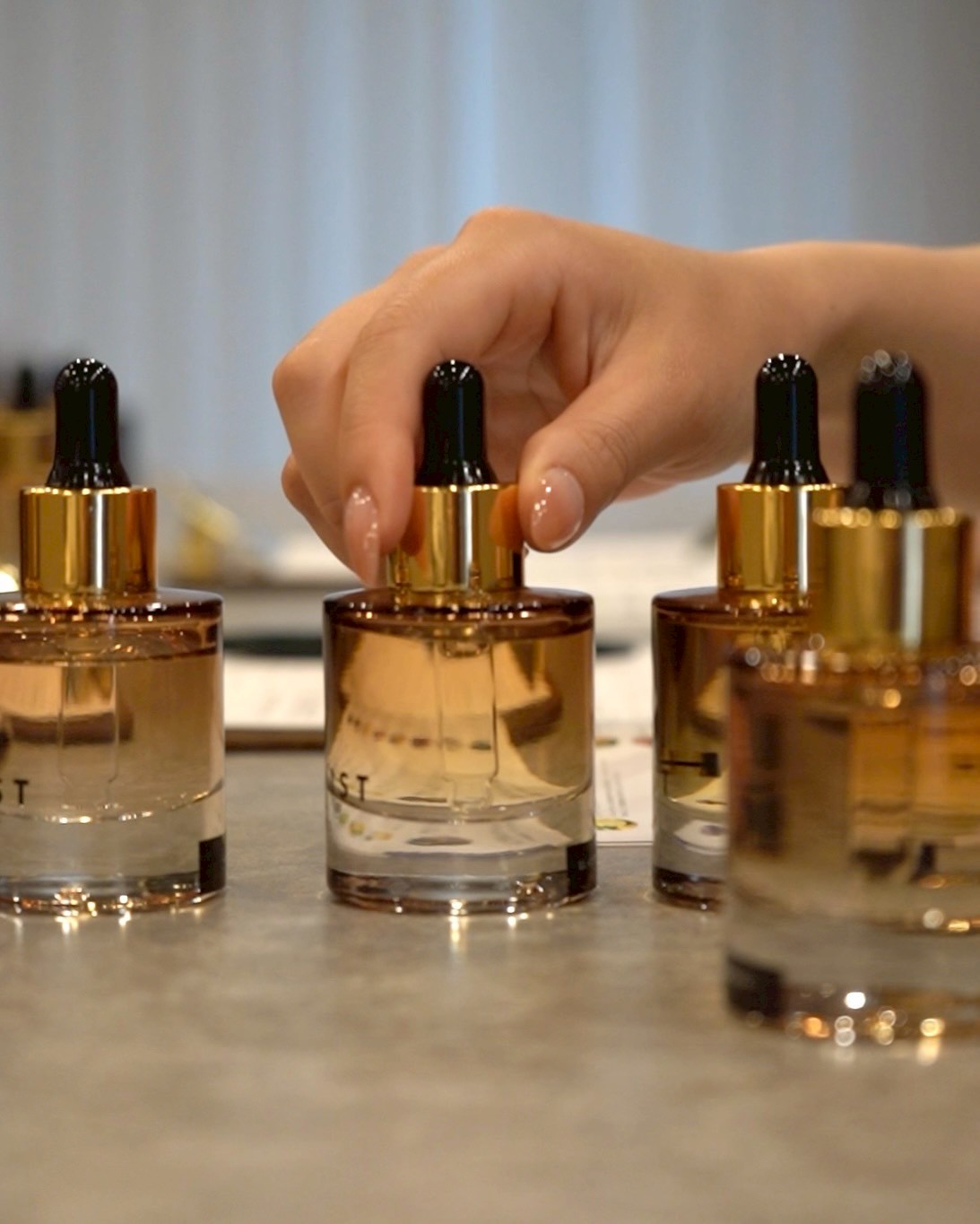理想の香りが完成したら、香料と専用液(アルコール+基材)をブレンドし、選んだボトルに詰めます。世界に一つ、あなただけの香水が誕生する瞬間です。